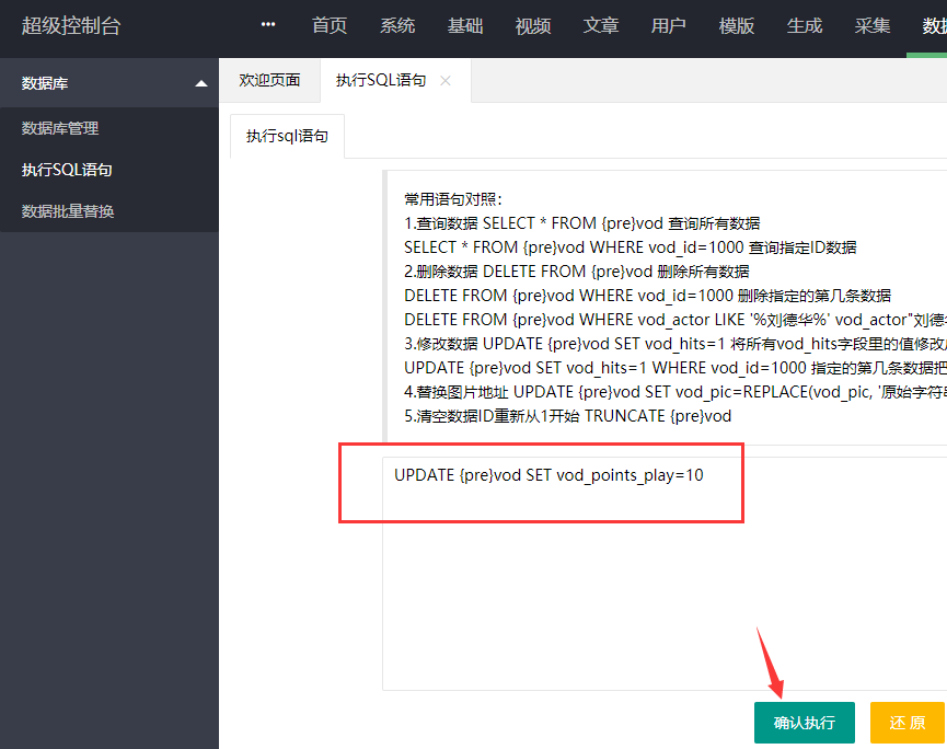 SQL语句2:UPDATE {pre}vod SET vod_points_play=10 WHERE vod_id=1000(此句的意思,视频ID为1000的视频,设置为10积分收费)