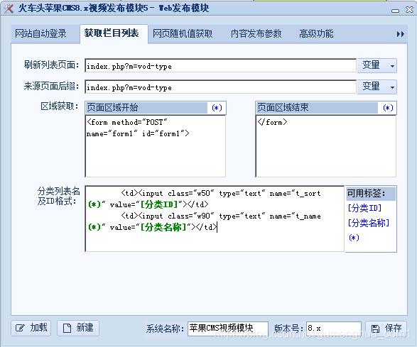 在1、选择发布模块的部分找到刚才保存的发布模块,如上图填写相关内容,这里说下全局变量,就是在登录苹果CMS后台时的安全码,另外接口可能需要根据自己的实际情况经行修改。