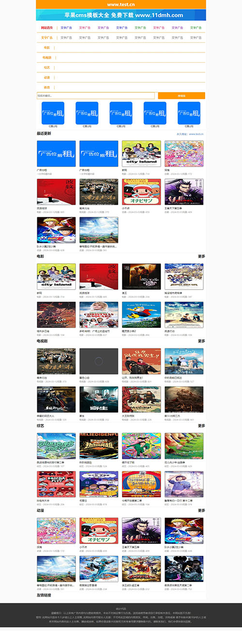 亮丽橙色设计,凸出网站地址栏,便于访客记忆,模板为pc、wap自适应代码,特别适合于电影站、x站使用。模板文件齐全,广告位都已经设置好了,可以直接拿来用。