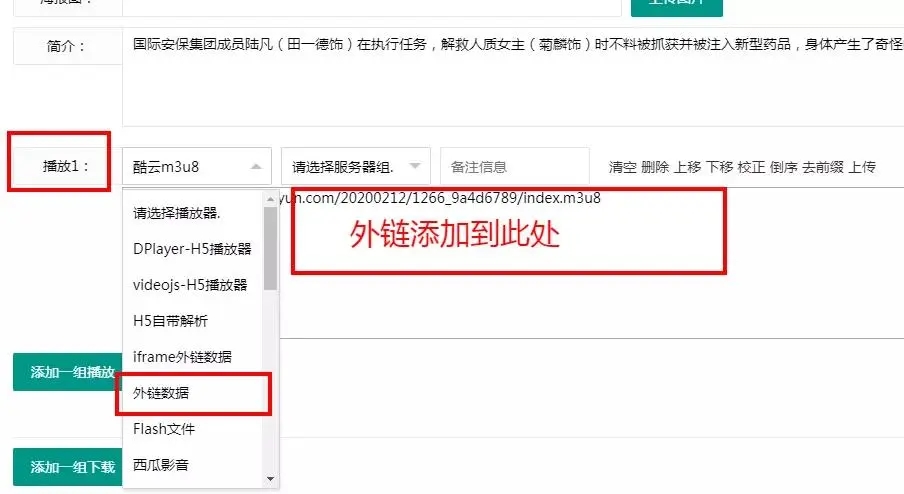 找到“播放1”选项,选择“外链数据”,将你找到的链接添加到此处即可。