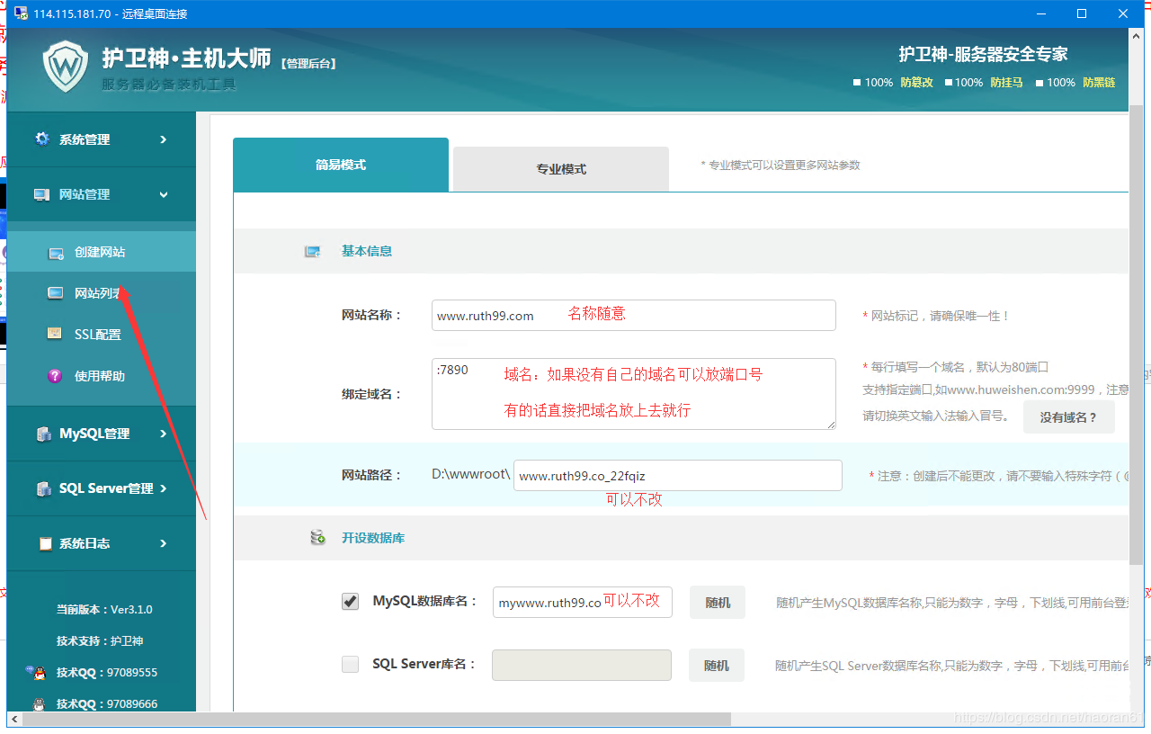 第八步:服务器地址127.0.0.1即可,端口3306,数据库的账号密码在安装护卫神的时候自己设置的,填进去就行,其他就后台账号密码填写一下,记得下一步之前先测试一下数据库的连接。