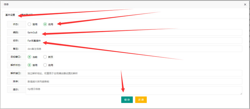 2,如果想成功的添加一个播放器需要安装下面的1到5的步骤进行填写。①基本设置→②状态为:启用→③编码:farm3u8→④名称:可以随意填写→⑤最后保存。然后把我们的播放器编码复制粘贴到播放器代码里面保存即可。
