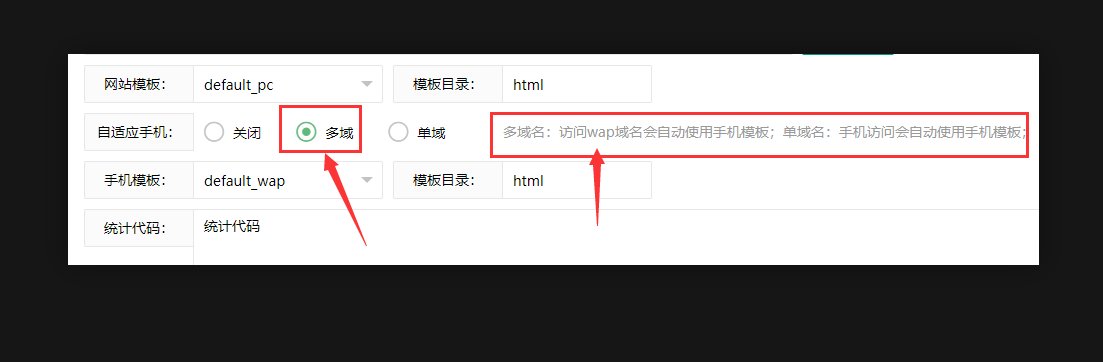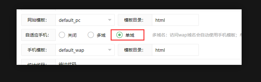 4、如果安装的是手机端模板,【自适应手机】就设置为【单域】,设置好【手机端模板】就可以了;
