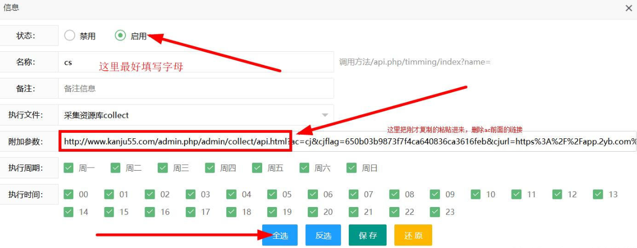 这里着重说一下附加参数这一条,图片上的是刚才复制的采集当天的链接,直接复制进去是错误的,我们来修改一下