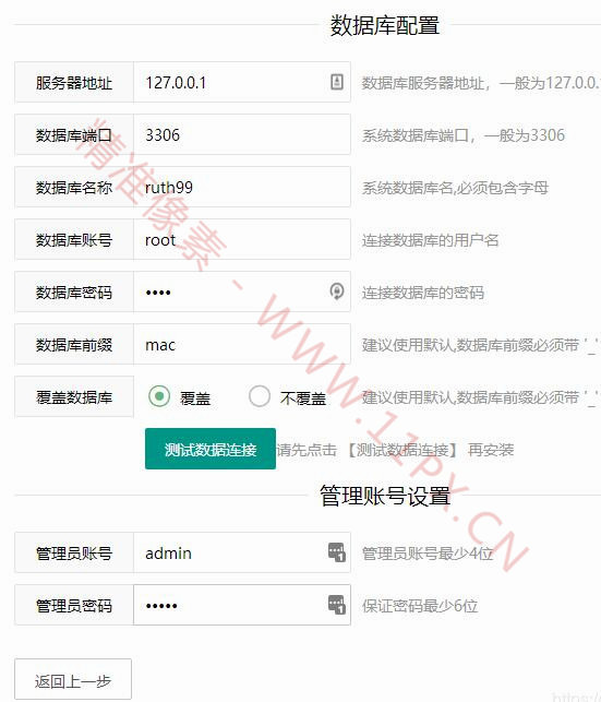 4、数据库配置。服务器地址、端口一般默认即可,其他的数据库账号、密码根据自己环境填写,记得下一步之前先测试一下数据库的连接。后台账号密码为您后台的登录账号密码。