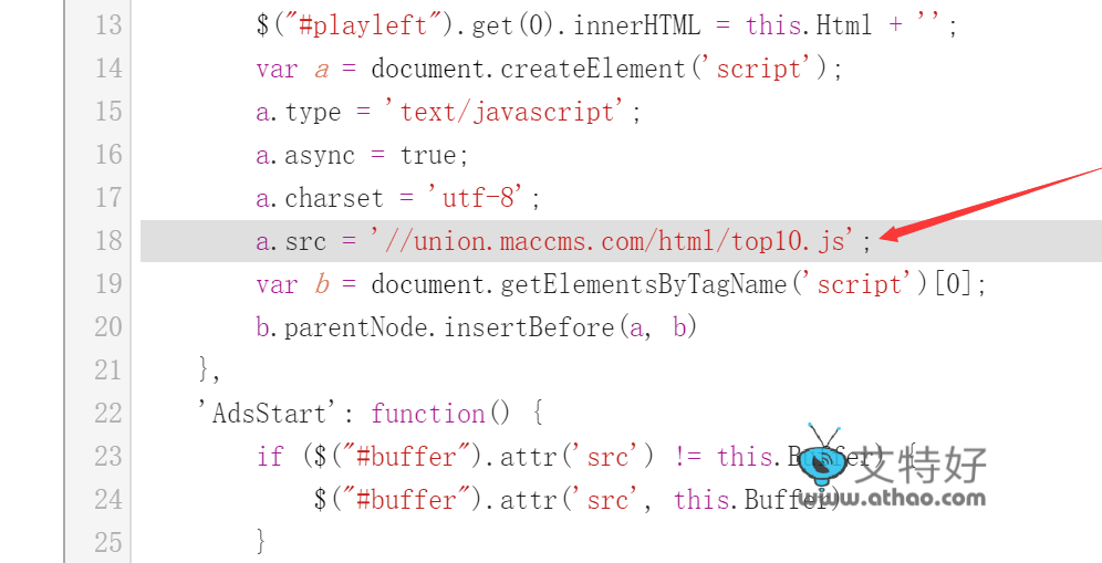 其文件就是 /static/js/player.js 文件,每次播放页播放的时候,有一定概率会加载//union.maccms.com/html/top10.js中的广告代码。