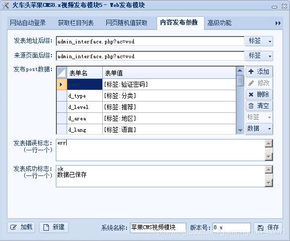 在1、选择发布模块的部分找到刚才保存的发布模块,如上图填写相关内容,这里说下全局变量,就是在登录苹果CMS后台时的安全码,另外接口可能需要根据自己的实际情况经行修改。