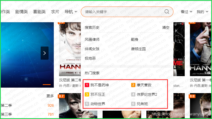 1,热门搜索词就是鼠标点击搜索框后自动弹出的热门影片片名,原则是通过访问网站的人根据搜索词的次数多少排序产生的。