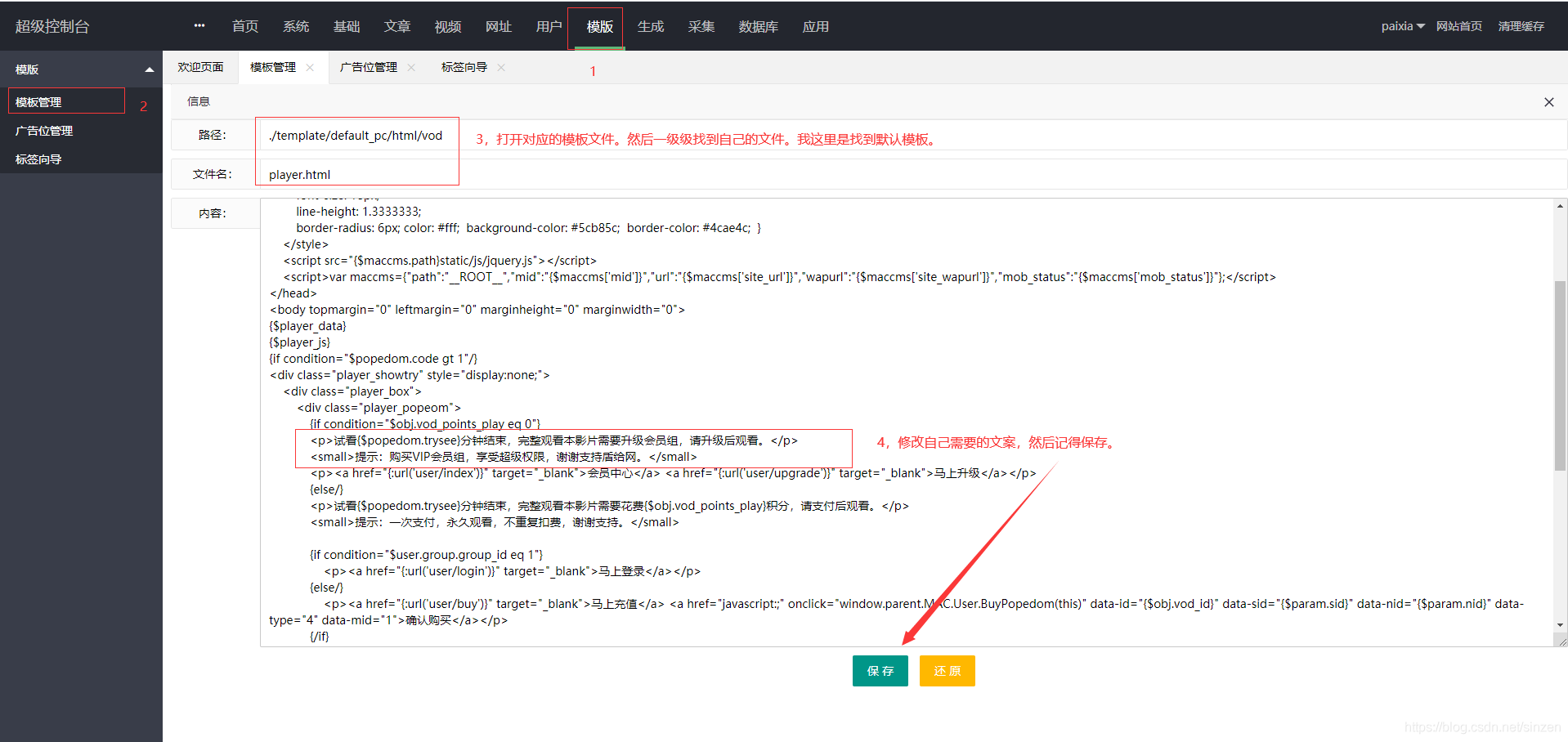 就是登陆苹果cms系统后台管理进行修改。按照下面截图所示的5个操作步骤。我这里是以苹果cms默认自带的模板为例。所以模板路径可能会和你的不一样。你只需找到自己正在使用的苹果cms模板路径进行修改即可。