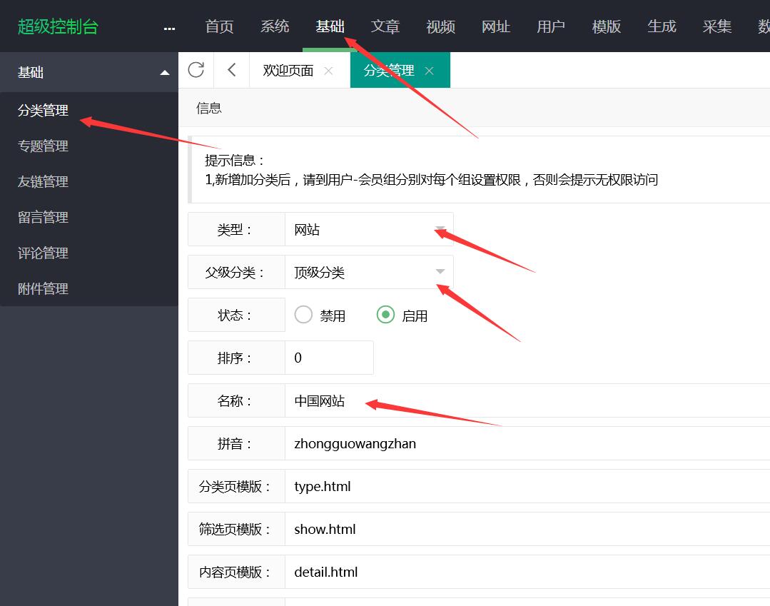 首先在基础管理的地方增加好网址导航的分类
