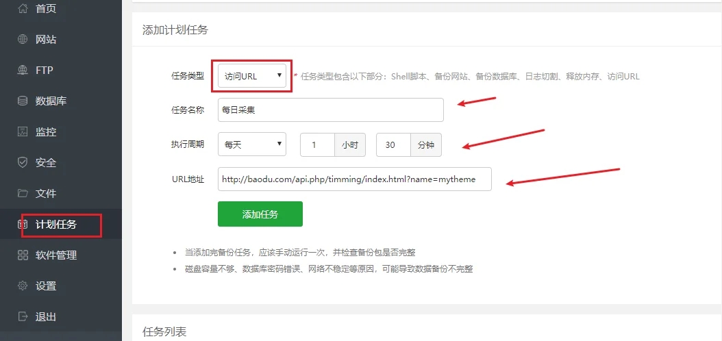 6,复制刚才的链接进入宝塔后台界面找到计划任务,按照图片所示添加任务,注意url地址填写刚复制的测试采集页面的地址,选择访问URL任务,按自己的需求填写执行周期参数后保存。
