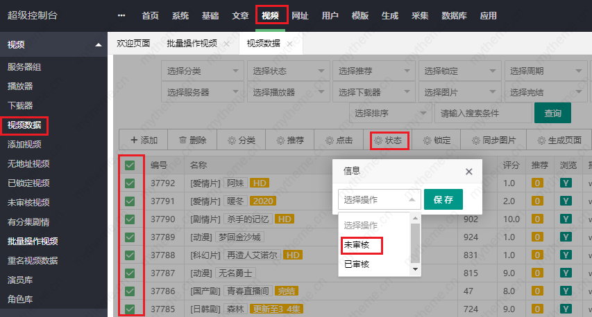 2,隐藏某些:视频->视频数据勾选要隐藏的视频,然后点击“状态”选择未审核隐藏状态然后保存即可,这里就只修改你勾选的视频为隐藏状态。