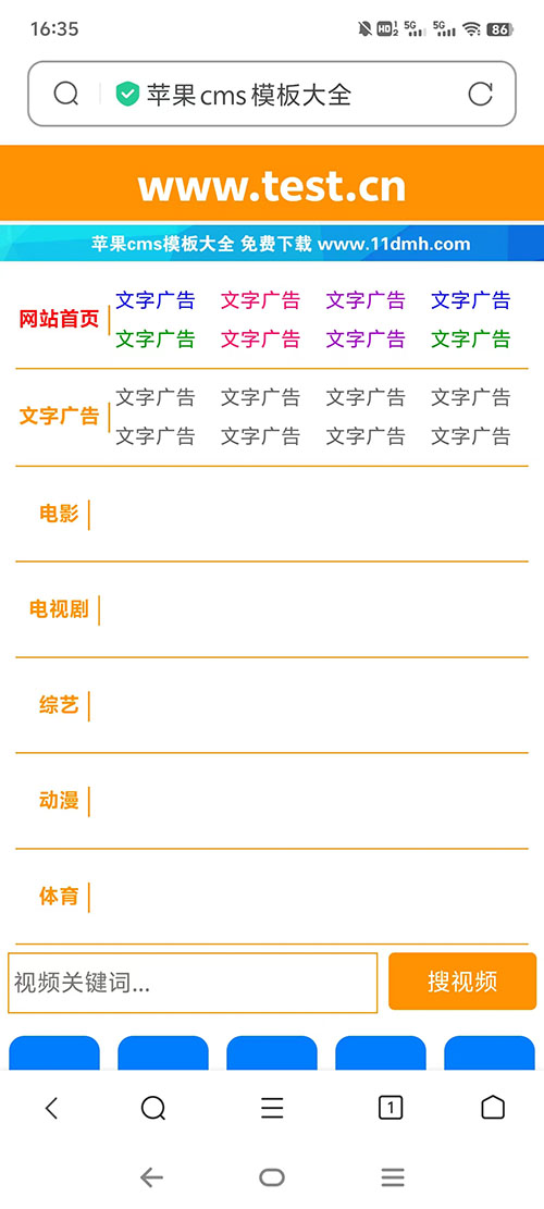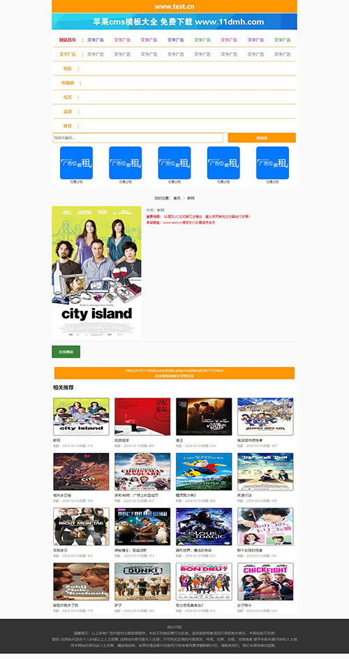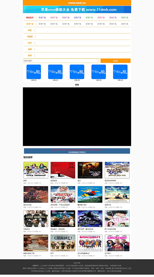 亮丽橙色设计,凸出网站地址栏,便于访客记忆,模板为pc、wap自适应代码,特别适合于电影站、x站使用。模板文件齐全,广告位都已经设置好了,可以直接拿来用。