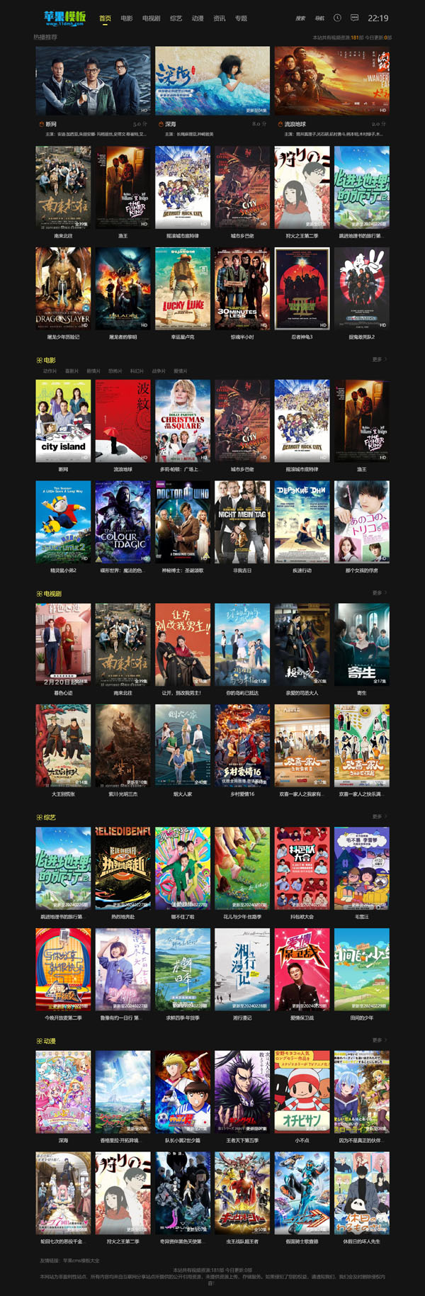 这次模板升级的目的,是为了适配于影视站,所以围绕详情页进行了比较多升级,如果你希望是首页、分类、详情、播放的层级结构,这款简约黑色样式,一定不要错过!代码支持pc、wap自适应访问,推荐模板!