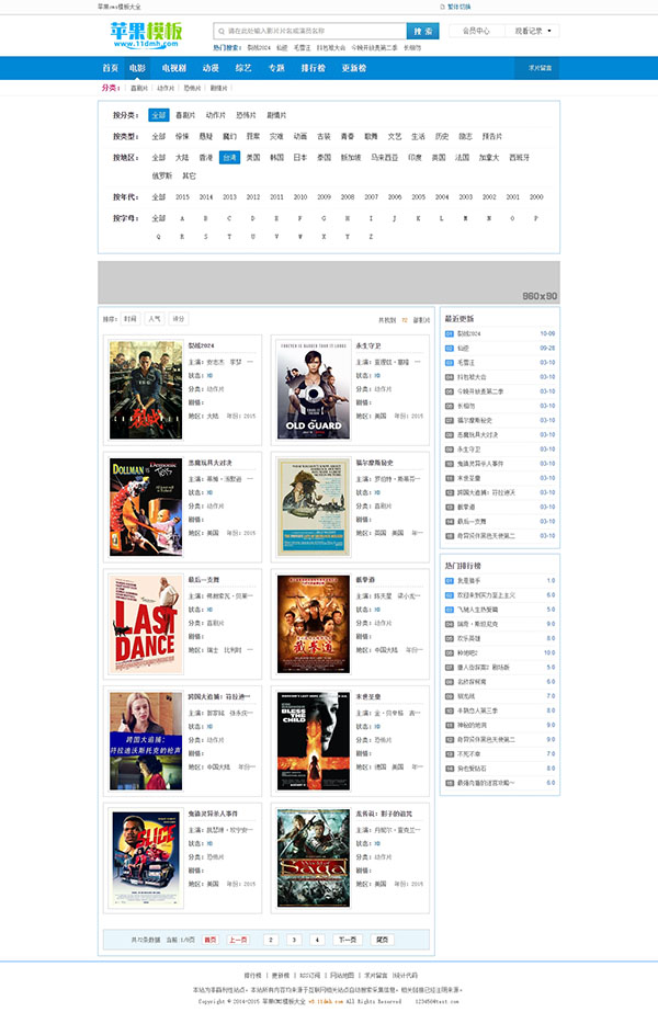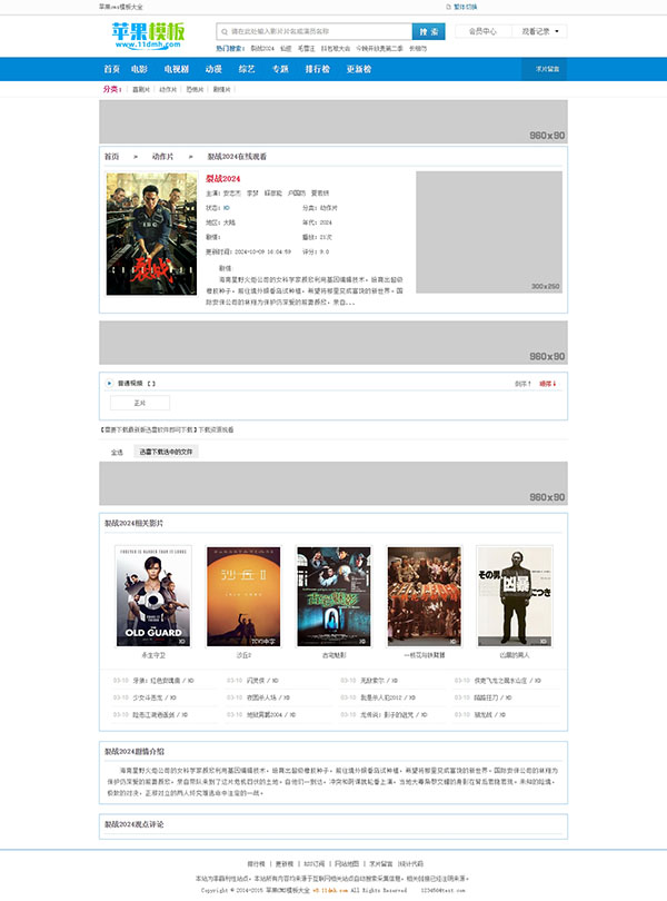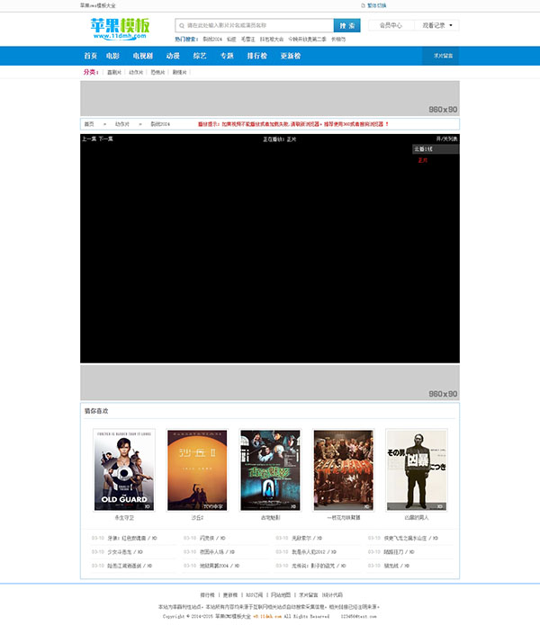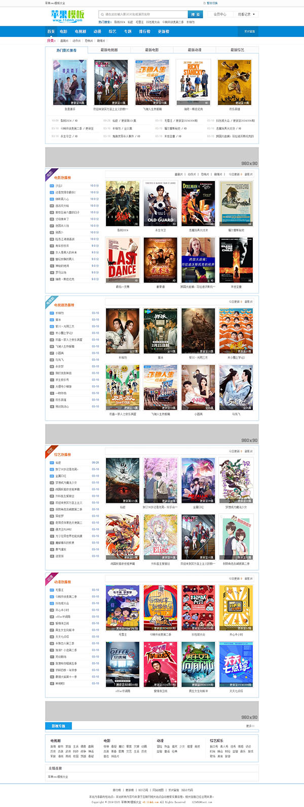 传统经典蓝色影视网站风格,导航部分做了两行,可以兼顾大类及子类;取消了幻灯片功能,替换为了活动窗口展示,并可以跟随鼠标滑动,展示更多影视内容;该模板唯一缺点,就是只有电脑端,稍显遗憾,建议可以跟本站蓝色简洁影视wap手机端3号模板组合一下,实现pc、wap双端模板访问。